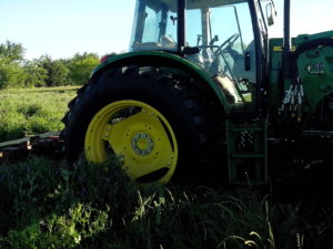 Shredding the cover crop in April 2017. I started by cutting it, since Kim wanted the cover crop bailed for her sheep, but the crop was so abundant that it was getting stuck between the cutter and the tractor. I gave up on cutting and switched to shredding.